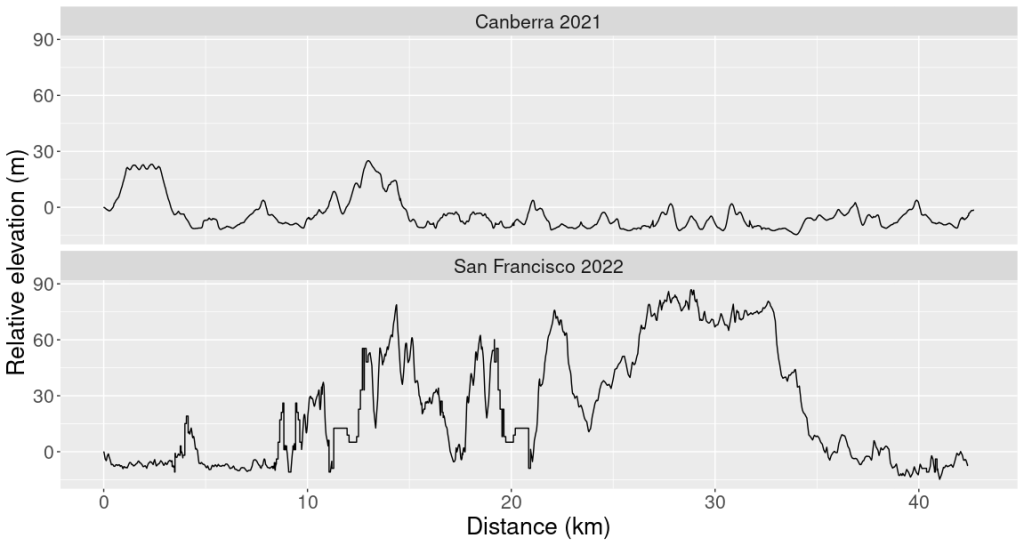 On July 24th I ran the 2022 San Francisco (SF) marathon. All marathons are the same distance, 42.2 kilometres (26.2 miles) but individual courses can vary greatly. Some marathons are on road and others are on trails. Some locations can be hot and others can be rainy. And some, such as the SF marathon, can be much hillier than others. Below is a plot comparing the elevation of the Canberra marathon I ran last year to the elevation of the SF marathon: