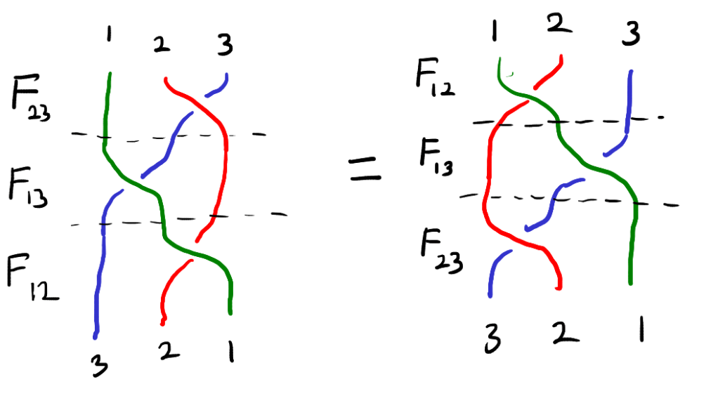 This equation can be visualized as the “braid relation” shown below. Here the strings represent the three particles and interacting two particles corresponds to crossing one string over the other.