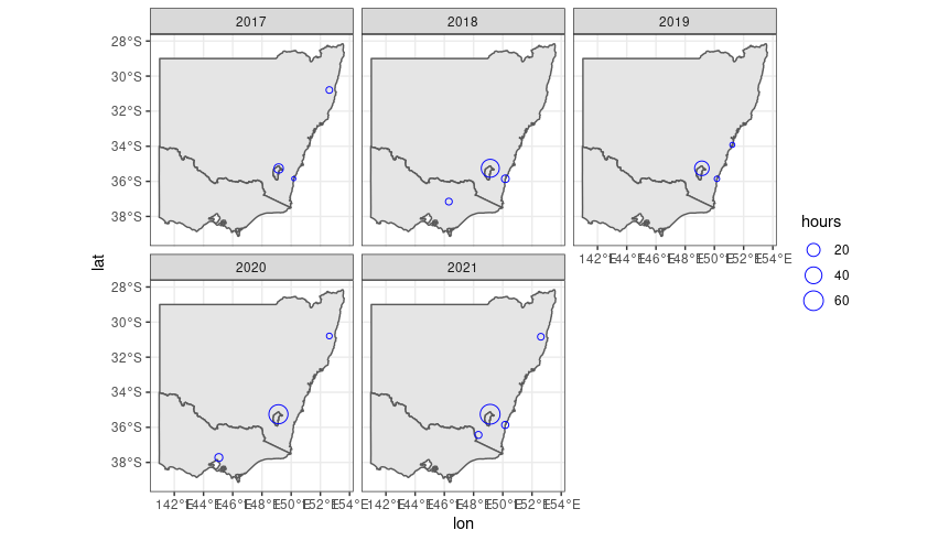 I’ve recently had some fun downloading and displaying my running data from Strava. I’ve been tracking my runs on Strava for the last five years and I thought it would be interesting to make a map showing where I run. Here is one of the plots I made. Each circle is a place in south east Australia where I ran in the given year. The size of the circle corresponds to how many hours I ran there.